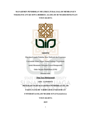 Ning Tyas Mudzayanah, NIM.: 18104090070 (2025) MANAJEMEN PENDIDIKAN MULTIKULTURAL DALAM MEMBANGUN TOLERANSI ANTAR SISWA BERBEDA AGAMA DI SD NEGERI DEMANGAN YOGYAKARTA. Skripsi thesis, UIN SUNAN KALIJAGA YOGYAKARTA.