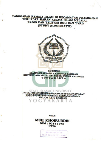 Muh. Khoirudin, NIM.: 02862698 (1996) TANGGAPAN REMAJA ISLAM DI KECAMATAN PRAMBANAN TERHADAP SIARAN AGAMA ISLAM MELALUI RADIO DAN TELEVISI (RRI DAN TVRI) (STUDI KOMPERATIF). Skripsi thesis, UIN SUNAN KALIJAGA YOGYAKARTA.