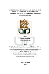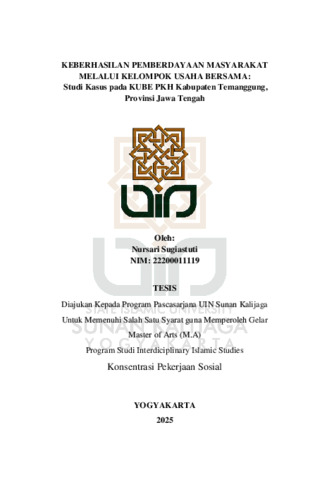Nursari Sugiastuti, NIM.: 22200011119 (2025) KEBERHASILAN PEMBERDAYAAN MASYARAKAT MELALUI KELOMPOK USAHA BERSAMA: STUDI KASUS PADA KUBE PKH KABUPATEN TEMANGGUNG, PROVINSI JAWA TENGAH. Masters thesis, UIN SUNAN KALIJAGA YOGYAKARTA.