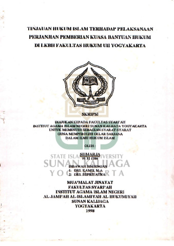 Sumarja, NIM.: 91321386 (1998) TINJAUAN HUKUM ISLAM TERHADAP PELAKSANAAN PERJANJIAN PEMBERIAN KUASA BANTUAN HUKUM DI LKBH FAKULTAS HUKUM UII YOGYAKARTA. Skripsi thesis, UIN SUNAN KALIJAGA YOGYAKARTA.