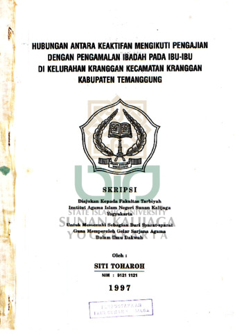 Siti Toharoh, NIM:.91211121 (1998) HUBUNGAN ANTARA KEAKTIFAN MENGIKUTI PENGAJIAN DENGAN PENGAMALAN IBADAH PADA IBU-IBU DI KELURAHAN KRANGGAN KECAMATAN KRANGGAN KABUPATEN TEMANGGUNG. Skripsi thesis, UIN SUNAN KALIJAGA YOGYAKARTA.