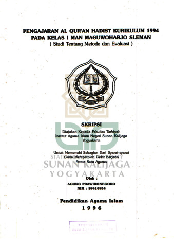 Agung Prawironegoro, NIM.: 89410954 (1996) PENGAJARAN AL QUR'AN HADIST KURIKULUM 1994 PADA KELAS I MAN MAGUWOHARJO SLEMAN ( STUDI TENTANG METODE DAN EVALUASI ). Skripsi thesis, UIN SUNAN KALIJAGA YOGYAKARTA.