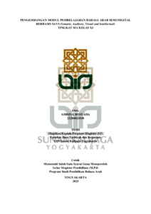 Penelitian ini dilatarbelakangi oleh hasil temuan dari observasi peneliti, yaitu ketersediaan modul pembelajaran cetak dan buku teks yang terbatas, selain itu modul pembelajaran yang ada belum mengakomodir gaya belajar peserta didik. Permasalahan tersebut menyebabkan kesulitan belajar dan menghambat guru dalam proses mengajar. Maka penelitian ini bertujuan untuk melngelmbangkan modul pembelajaran bahasa Arab kellas XI. Tujuan penelitian ini diantaranya: 1) Untuk mengembangkan modul pembelajaran bahasa Arab semi digital belrbasis SAVI tingkat MA kelas XI. 2) Untuk melngeltahui kellayakan modul pembelajaran bahasa Arab semi digital berbasis SAVI tingkat MA kelas XI. 3) Untuk melngeltahui elfelktivitas modul pembelajaran bahasa Arab semi digital belrbasis SAVI pada peserta didik kellas XI MAN 3 Slelman. Jenis penelitian ialah Relselrach and Delvellopmelnt (R&D) dengan Model ADDIE. Sumber data penelitian ini menggunakan desain Quasi-Eksperimen Non Equivalent Control (Pre test - post test) dengan teknik populasi – sampel. Teknik dan instrumen pengumpulan data menggunakan wawancara, observasi, tes, kuesioner dan dokumentasi lapangan. Teknik analisis data menggunakan skala likert pada validitas ahli materi dan ahli media. Uji efektivitas modul ini menggunakan uji independent sample t-test. Peneliti menggunakan bantuan SPSS 31.1 version untuk menganalisis data. Hasil penelitian ini ialah menghasilkan: 1) Produk modul pembelajaran bahasa Arab semi digital berbasis SAVI kelas XI yang berisikan materi al-mufradat dilengkapi gambar, al- ḥiwār dilengkapi audio-visual, al-qirā’ah, al-qawāid, tadrībāt, papan permainan crossword, Sumatif Akhir Semester dan Sumatif Akhir Tahun. 2) Kelayakan modul pembelajaran dinilai dari Hasil Uji Validitas instrumen ahli media memiliki skor 81.67 % “Sangat Layak” dan ahli materi memiliki skor 69.17% “Layak. 3) Efektivitas modul pembelajaran bahasa Arab berbasis SAVI pada uji N-Gain Score terhadap hasil belajar peserta didik menunjukkan skor 71.20% dengan kategori “Cukup Efektif” pada kelas eksperimen. Kata Kunci: Modul pembelajaran semi digital, Model SAVI, Tingkat MA kelas XI