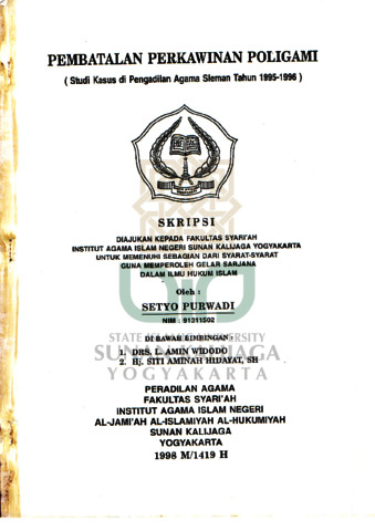 Setyo Purwadi, NIM.: 91311502 (1998) PEMBATALAN PERKAWINAN POLIGAMI (STUDI KASUS DI PENGADILAN AGAMA SLEMAN TAHUN 1995-1996). Skripsi thesis, UIN SUNAN KALIJAGA YOGYAKARTA.