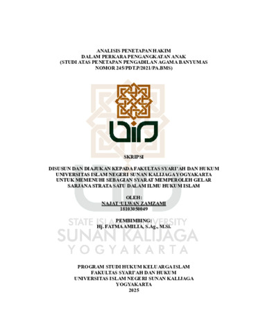 Najat ‘Ulwan Zamzami, NIM.: 18103050049 (2025) ANALISIS PENETAPAN HAKIM DALAM PERKARA PENGANGKATAN ANAK (STUDI ATAS PENETAPAN PENGADILAN AGAMA BANYUMAS NOMOR 245/PDT.P/2021/PA.BMS). Skripsi thesis, UIN SUNAN KALIJAGA YOGYAKARTA.