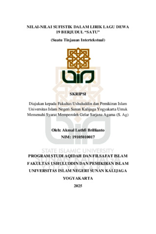 Akmal Luthfi Brillianto, NIM.: 19105010017 (2025) NILAI-NILAI SUFISTIK DALAM LIRIK LAGU DEWA 19 BERJUDUL “SATU” (SUATU TINJAUAN INTERTEKSTUAL). Skripsi thesis, UIN SUNAN KALIJAGA YOGYAKARTA.