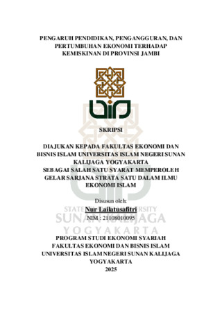 Nur Lailatusafitri, NIM.: 21108010095 (2025) PENGARUH PENDIDIKAN, PENGANGGURAN, DAN PERTUMBUHAN EKONOMI TERHADAP KEMISKINAN DI PROVINSI JAMBI. Skripsi thesis, UIN SUNAN KALIJAGA YOGYAKARTA.