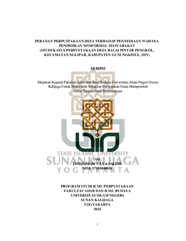 Istiqomah ‘Ulya Salimi, NIM.: 17101040026 (2024) PERANAN PERPUSTAKAAN DESA TERHADAP PENYEDIAAN WAHANA PENDIDIKAN NONFORMAL MASYARAKAT (STUDI KASUS PERPUSTAKAAN DESA BALAI PINTAR PENGKOL, KECAMATAN NGLIPAR, KABUPATEN GUNUNGKIDUL, DIY). Skripsi thesis, UIN SUNAN KALIJAGA YOGYAKARTA.