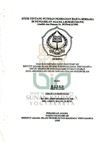 Text (STUDI TENTANG PUTUSAN PEMBAGIAN HARTA BERSAMA DI PENGADILAN AGAMA LHOKSEUMAWE (ANALISIS ATAS PUTUSAN NO. 201/PERDT.G/1990))