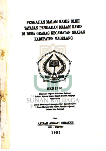 Asifah Aswati Hidayah, NIM.: 91221150 (1997) PENGAJIAN MALAM KAMIS OLEH YAYASAN PENGAJIAN MALAM KAMIS DI DESA GRABAG KECAMATAN GRABAG KABUPATEN MAGELANG (TINJAUAN METODE DAKWAH). Skripsi thesis, UIN SUNAN KALIJAGA YOGYAKARTA.