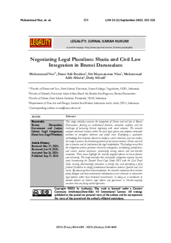 Muhammad Nur, - and Ibnor Azli Ibrahim, - and Siti Maymanatun Nisa, - and Muhammad Adib Alfarisi, - and Dedy Afriadi, - (2025) Negotiating Legal Pluralism: Sharia and Civil Law Integration in Brunei Darussalam. LEGALITY: Jurnal Ilmiah Hukum, 33 (2). pp. 535-552. ISSN ISSN (Print) 0854-6509-ISSN (Online) 2549-4600