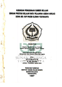 Sistem belajar-mengajar melibatkan berbagai komponen yang saling berinteraksi, salah satunya adalah sumber belajar. Penelitian ini didasari oleh kondisi terbatasnya waktu pembelajaran di sekolah, khususnya untuk mata pelajaran Aqidah Akhlaq. Hal ini menyebabkan pengetahuan siswa hanya bergantung pada guru , padahal seharusnya sistem Cara Belajar Siswa Aktif (CBSA) membuat siswa tidak hanya bergantung pada guru dan mengandalkan pengetahuan yang diperoleh dari guru. Berdasarkan latar belakang tersebut, penelitian ini dilakukan untuk mengetahui seberapa besar pengaruh sumber belajar yang digunakan oleh siswa MTs YAPI Pakem terhadap prestasi belajar mereka. Penelitian ini bertujuan untuk: 1. Mengetahui fasilitas sumber belajar mata pelajaran Aqidah Akhlaq yang dimiliki oleh MTs YAPI Pakem. 2. Mengetahui sumber belajar yang digunakan dalam proses belajar mengajar mata pelajaran Aqidah Akhlaq di MTs YAPI Pakem. 3. Mengetahui prestasi belajar yang dicapai oleh siswa MTs YAPI Pakem dalam mata pelajaran Aqidah Akhlaq. 4. Membuktikan ada atau tidaknya hubungan positif yang signifikan antara penggunaan sumber belajar dengan prestasi belajar siswa. Metode penelitian yang digunakan adalah metode kualitatif deskriptif analitis. Data dikumpulkan melalui angket, wawancara, dan observasi. Teknik analisis data yang digunakan adalah kualitatif dan kuantitatif (statistik). Subjek penelitian adalah kepala sekolah, guru mata pelajaran Aqidah Akhlaq, serta siswa kelas I dan II MTs YAPI Pakem. Hasil penelitian ini Adalah MTs YAPI Pakem memiliki sumber belajar Aqidah Akhlag yang lengkap dan pemanfaatan sumber belajar tersebut masih rendah. Ditemukan adanya hubungan positif yang signifikan antara penggunaan sumber belajar dengan prestasi belajar mata pelajaran Aqidah Akhlaq siswa MTs YAPI Pakem. Hipotesa yang diajukan yaitu "terdapat korelasi positif yang signifikan antara penggunaan sumber belajar dengan prestasi belajar mata pelajaran Aqidah Akhlaq siswa MTs YAPI Pakem" diterima.