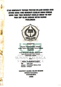 Ning Bakrom Bain, NIM.: 92421942 (1998) STUDI KOMPARATIF TENTANG PRESTASI BELAJAR BAHASA ARAB ANTARA SISWA YANG MENGIKUTI SEKOLAH DINIAH DENGAN SISWA YANG TIDAK MENGIKUTI SEKOLAH DINIAH “AN NUR” PADA SMP ISLAM SIMBANG WETAN BUARAN PEKALONGAN. Skripsi thesis, UIN SUNAN KALIJAGA YOGYAKARTA.