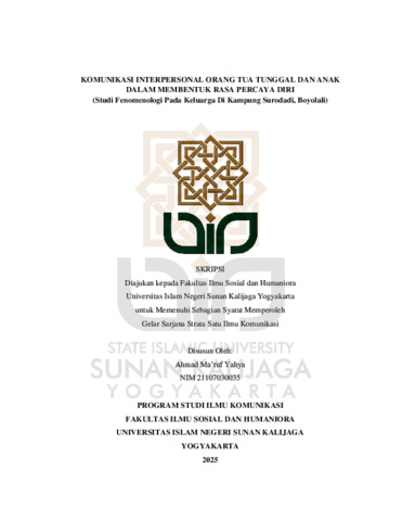 Ahmad Ma’ruf Yahya, NIM.: 21107030035 (2025) KOMUNIKASI INTERPERSONAL ORANG TUA TUNGGAL DAN ANAK DALAM MEMBENTUK RASA PERCAYA DIRI (STUDI FENOMENOLOGI PADA KELUARGA DI KAMPUNG SURODADI, BOYOLALI). Skripsi thesis, UIN SUNAN KALIJAGA YOGYAKARTA.