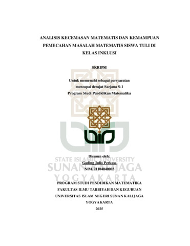 Gading Julio Perkasa, NIM.: 21104040003 (2025) ANALISIS KECEMASAN MATEMATIS DAN KEMAMPUAN PEMECAHAN MASALAH MATEMATIS SISWA TULI DI KELAS INKLUSI. Skripsi thesis, UIN SUNAN KALIJAGA YOGYAKARTA.