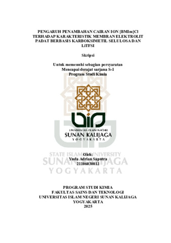 Yuda Adrian Saputra, NIM.: 21106030012 (2025) PENGARUH PENAMBAHAN CAIRAN ION [BMIm]Cl TERHADAP KARAKTERISTIK MEMBRAN ELEKTROLIT PADAT BERBASIS KARBOKSIMETIL SELULOSA DAN LiTFSI. Skripsi thesis, UIN SUNAN KALIJAGA YOGYAKARTA.