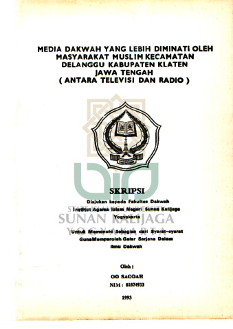 Oo Saodah, NIM.: 02874933 (1993) MEDIA DAKWAH YANG LEBIH DIMINATI OLEH MASYARAKAT MUSLIM KECAMATAN DELANGGU KABUPATEN KLATEN JAWA TENGAH ( ANTARA TELEVISI DAN RADIO). Skripsi thesis, UIN SUNAN KALIJAGA YOGYAKARTA.