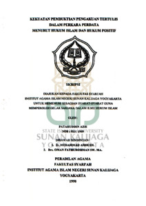 Patahuddin Azis, NIM.: 93311969 (1998) KEKUATAN PEMBUKTIAN PENGAKUAN TERTULIS DALAM PERKARA PERDATA MENURUT HUKUM ISLAM DAN HUKUM POSITIF. Skripsi thesis, UIN SUNAN KALIJAGA YOGYAKARTA.