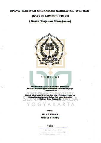 Winengan, NIM.: 95211856 (2000) UPAYA DAKWAH ORGANISASI NAHDLATUL ULAMA WATHAN (NW) DI LOMBOK TIMUR (SUATU TINJAUAN MANAJEMEN). Skripsi thesis, UIN SUNAN KALIJAGA YOGYAKARTA.
