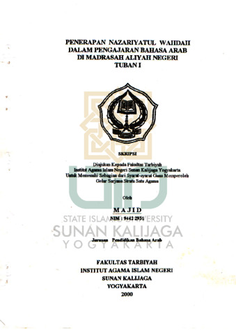 Majid, NIM.: 94422931 (2000) PENERAPAN NAZARIYATUL WAHDAH DALAM PENGAJARAN BAHASA ARAB DI MADRASAH ALIYAH NEGERI TUBAN I. Skripsi thesis, UIN SUNAN KALIJAGA YOGYAKARTA.