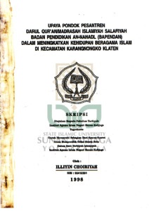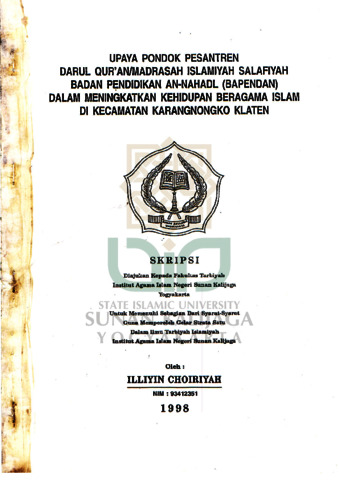 Text (UPAYA PONDOK PESANTREN DARUL QUR’AN/MADRASAH ISLAMIYAH SALAFIYAH BADAN PENDIDIKAN AN-NAHL (BAPENDAN) DALAM MENINGKATKAN KEHIDUPAN BERAGAMA ISLAM DI KECAMATAN KARANGNONGKO KLATEN)