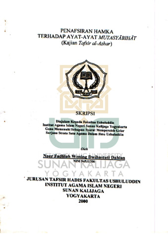 Noer Fadlilah Wening Dwihastuti Dahlan, NIM.: 94531706 (2000) PENAFSIRAN HAMKA TERHADAP AYAT-AYAT MUTASYABIHAT (KAJIAN TAFSIR AL-AZHAR). Skripsi thesis, UIN SUNAN KALIJAGA YOGYAKARTA.