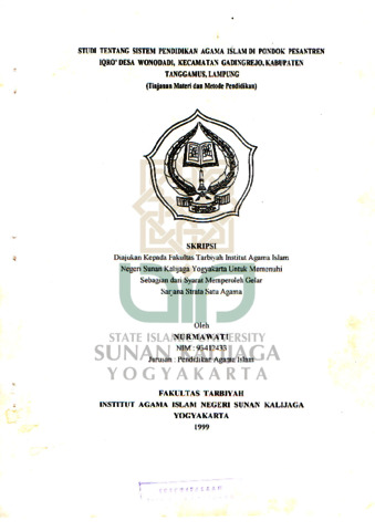 Nurmawati, NIM.: 93412433 (1999) STUDI TENTANG SISTEM PENDIDIKAN AGAMA ISLAM DI PONDOK PESANTREN IQRO’ DESA WONODADI, KECAMATAN GADINGREJO, KABUPATEN TANGGAMUS, LAMPUNG (TINJAUAN MATERI DAN METODE PENDIDIKAN). Skripsi thesis, UIN SUNAN KALIJAGA YOGYAKARTA.