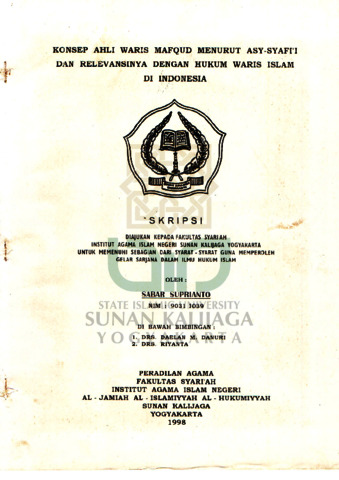 Sabar Suprianto, NIM.: 90311039 (1998) KONSEP AHLI WARIS MAFQUD MENURUT ASY - SYAFI'I DAN RELEVANSINYA DENGAN HUKUM WARIS ISLAM DI INDONESIA. Skripsi thesis, UIN SUNAN KALIJAGA YOGYAKARTA.