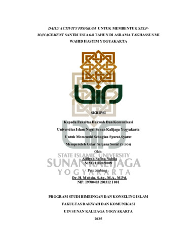 Alifiyah Safina Nabila, NIM.: 21102020009 (2025) DAILY ACTIVITY PROGRAM UNTUK MEMBENTUK SELF-MANAGEMENT SANTRI USIA 6-8 TAHUN DI ASRAMA TAKHASSUS MI WAHID HASYIM YOGYAKARTA. Skripsi thesis, UIN SUNAN KALIJAGA YOGYAKARTA.