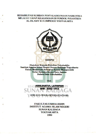 Ashlihatul Lathifah, NIM.: 93521413 (1999) REHABILITASI KORBAN PENYALAHGUNAAN NARKOTIKA MELALUI TERAPI KEAGAMAAN DI PONDOK PESANTREN AL-ISLAMIY KULONPRPGO YOGYAKARTA. Skripsi thesis, UIN SUNAN KALIJAGA YOGYAKARTA.
