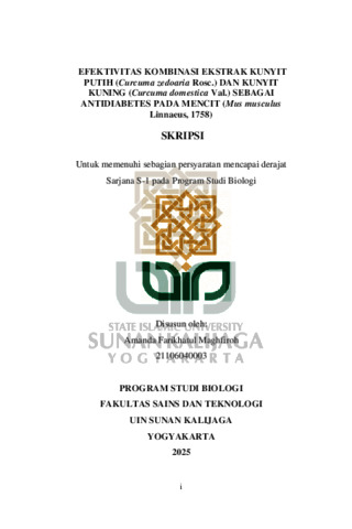 Amanda Farikhatul Maghfiroh, NIM. 21106040003 (2025) EFEKTIVITAS KOMBINASI EKSTRAK KUNYIT PUTIH (Curcuma zedoaria Rosc.) DAN KUNYIT KUNING (Curcuma domestica Val.) SEBAGAI ANTIDIABETES PADA MENCIT (Mus musculus Linnaeus, 1758). Skripsi thesis, UIN SUNAN KALIJAGA YOGYAKARTA.