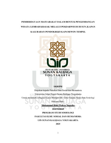 Muhammad Rizki Wahyu Nugroho, NIM.: 18107020049 (2025) PEMBERDAYAAN MASYARAKAT DALAM BENTUK PENGEMBANGAN WISATA LEMBAH KRASAK MELALUI POKDARWIS DI DUSUN JLAPAN KALURAHAN PONDOKREJO KAPANEWON TEMPEL. Skripsi thesis, UIN SUNAN KALIJAGA YOGYAKARTA.