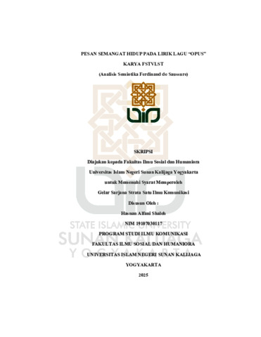 Hasnan Alfani Shaleh, NIM.: 19107030117 (2025) PESAN SEMANGAT HIDUP PADA LIRIK LAGU “OPUS” KARYA FSTVLST (ANALISIS SEMIOTIKA FERDINAND DE SAUSSURE). Skripsi thesis, UIN SUNAN KALIJAGA YOGYAKARTA.