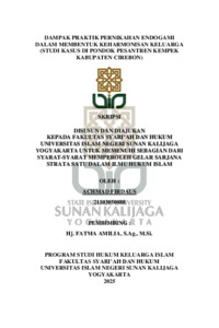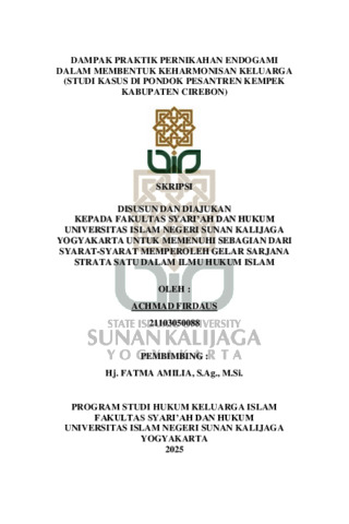 Penelitian ini membahas praktik pernikahan endogami terhadap pembentukan keharmonisan keluarga di kalangan keluarga Pondok Pesantren Kempek Kabupaten Cirebon. Pernikahan endogami, yaitu pernikahan antar individu yang masih memiliki hubungan kekerabatan, telah menjadi praktik umum yang dilatarbelakangi oleh nilai tradisi, perjodohan, dan usaha menjaga kesinambungan nasab serta keharmonisan sosial di kalangan keluarga besar pesantren. Meskipun demikian, praktik ini menimbulkan pertanyaan terkait efektivitasnya dalam membangun keharmonisan keluarga. Tujuan utama penelitian ini adalah untuk mengkaji upaya-upaya membentuk keluarga harmonis berdasarkan konsep keluarga sakinah. Penelitian ini merupakan penelitian lapangan dengan metode kualitatif deskriptif dan pendekatan normatif, melalui teknik pengumpulan data berupa wawancara mendalam, dokumentasi, dan studi pustaka. Hasil penelitian menunjukkan bahwa meskipun praktik pernikahan endogami seringkali dilakukan berdasarkan keputusan orang tua dan tradisi keluarga, hal tersebut tidak serta merta menjadi penghambat terwujudnya keluarga harmonis. Keharmonisan justru dibentuk melalui faktor-faktor lain, seperti pemahaman agama yang kuat, komunikasi yang sehat, serta sikap saling menerima dan bekerja sama dalam menghadapi persoalan rumah tangga. Dengan demikian, praktik pernikahan endogami di kalangan keluarga Pondok Pesantren Kempek tidak menghalangi terbentuknya keluarga harmonis selama terdapat komitmen bersama, penerapan nilai-nilai keagamaan yang kokoh, serta pemahaman yang baik mengenai peran dan tanggung jawab dalam rumah tangga. Penelitian ini diharapkan dapat memberikan kontribusi dalam pengembangan wacana hukum keluarga Islam ii serta menjadi acuan bagi masyarakat untuk memahami pernikahan endogami dari sudut pandang yang lebih komprehensif, baik dari segi hukum, sosial, maupun budaya. Kata kunci: Pernikahan Endogami, Keharmonisan Keluarga, Upaya Mewujudkan Keharmonisan Keluarga