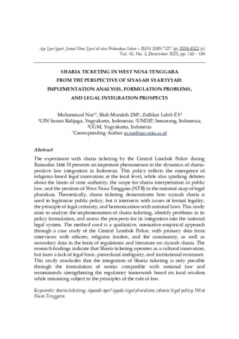 Muhammad Nur, - and Iffah Munifah ZM, - and Zulfikar Labib EY, - (2025) SHARIA TICKETING IN WEST NUSA TENGGARA FROM THE PERSPECTIVE OF SIYASAH SYAR'IYYAH: IMPLEMENTATION ANALYSIS, FORMULATION PROBLEMS, AND LEGAL INTEGRATION PROSPECTS. Asy Syar’iyyah: Jurnal Ilmu Syari’ah dan Perbankan Islam, 10 (2). pp. 160-184. ISSN ISSN 2089-7227 (p) 2598-8522(e