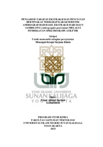 Pengaruh Tahapan Ekstraksi dan Pencucian Bertingkat terhadap Karakteristik Andrografolid Hasil Ekstraksi dari Daun Sambiloto (Andrographis paniculata) melalui Pendekatan Spektroskopi ATR-FTIR telah dilakukan. Penelitian ini bertujuan mengekstraksi senyawa andrografolid dari daun sambiloto (Andrographis paniculata) menggunakan maserasi etanol yang dilanjutkan dengan perlakuan ekstraksi lanjutan dan pencucian bertingkat serta tanpa perlakuan dengan mengkaji pengaruhnya melalui spektroskopi ATR-FTIR. Ekstraksi andrografolid dari daun sambiloto dilakukan menggunakan metode maserasi dengan pelarut etanol, dilanjutkan perlakuan dengan ekstraksi lanjutan dan pencucian bertingkat serta tanpa perlakuan. Analisis pengaruh perlakuan melalui pendekatan ATR-FTIR terhadap karakteristik hasil ekstraksi andrografolid. Ekstrak yang diperoleh dengan perlakuan ekstraksi lanjutan dan pencucian bertingkat bertekstur rapuh berwarna cokelat dengan rendemen 1,54%, sedangkan yang tanpa perlakuan diperoleh ekstrak kental hijau dengan rendemen 5%. Kedua ekstrak menunjukkan karakteristik khas spektrum standar andrografolid pada literatur dengan kemunculan gugus fungsi hidroksil dengan ikatan hidrogen pada pita serapan 3390cm-1, 1723cm-1 (γ-lakton), 1671cm-1 (gugus α,β tidak jenuh), dan 907cm-1 (=CH2). Tahapan ekstraksi lanjutan dan pencucian bertingkat memberikan pengaruh berupa perubahan pergeseran pita serapan dan/atau perubahan intensitas pada spektrum dibandingkan tanpa perlakuan, tetapi kedua spektrum “mirip” berdasarkan nilai cosine similarity 0,98, yang menunjukkan bahwa kedua spektrum tidak berbeda signifikan, sehingga metode ekstraksi xv maserasi etanol tanpa perlakuan melalui pendekatan spektroskopi ATR-FTIR dapat digunakan sebagai metode simplifikasi pre-analisis andrografolid. Kata Kunci : Daun Sambiloto, Andrografolid, Isolasi, Ekstraksi, ATR-FTIR