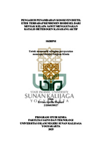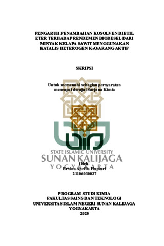 Ervina Aprilia Hapsari, NIM.: 21106030027 (2025) PENGARUH PENAMBAHAN KOSOLVEN DIETIL ETER TERHADAP RENDEMEN BIODESEL DARI MINYAK KELAPA SAWIT MENGGUNAKAN KATALIS HETEROGEN K2O/ARANG AKTIF. Skripsi thesis, UIN SUNAN KALIJAGA YOGYAKARTA.