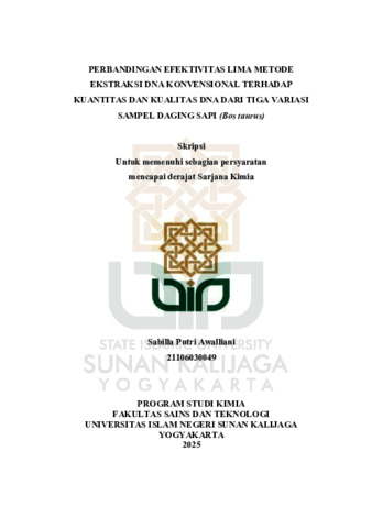Sabilla Putri Awalliani, NIM.: 21106030049 (2025) PERBANDINGAN EFEKTIVITAS LIMA METODE EKSTRAKSI DNA KONVENSIONAL TERHADAP KUANTITAS DAN KUALITAS DNA DARI TIGA VARIASI SAMPEL DAGING SAPI (Bos taurus). Skripsi thesis, UIN SUNAN KALIJAGA YOGYAKARTA.
