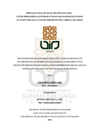 Text (PERWALIAN DALAM AKAD NIKAH BAGI JANDA (STUDI PERBANDINGAN PENDAPAT IMAM ABU HANIFAH DAN IMAM AS-SYAFI‘I MELALUI ANALISIS HERMENEUTIKA ABDULLAH SAEED))