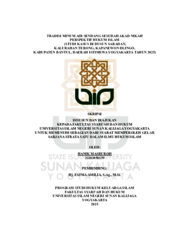 Text (TRADISI MINUM AIR SENDANG SESUDAH AKAD NIKAH PERSPEKTIF HUKUM ISLAM (STUDI KASUS DI DUSUN SARADAN, KALURAHAN TERONG, KAPANEWON DLINGO, KABUPATEN BANTUL, DAERAH ISTIMEWA YOGYAKARTA TAHUN 2025))