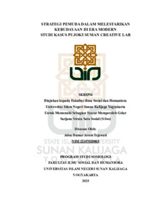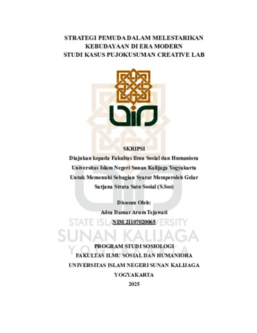 Adea Damar Arum Tejawati, NIM.: 21107020065 (2025) STRATEGI PEMUDA DALAM MELESTARIKAN KEBUDAYAAN DI ERA MODERN STUDI KASUS PUJOKUSUMAN CREATIVE LAB. Skripsi thesis, UIN SUNAN KALIJAGA YOGYAKARTA.