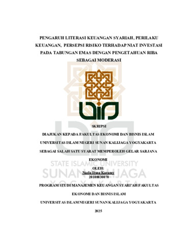 Nazla Itsna Karamy, NIM.: 20108030070 (2025) PENGARUH LITERASI KEUANGAN SYARIAH, PERILAKU KEUANGAN, PERSEPSI RISIKO TERHADAP NIAT INVESTASI PADA TABUNGAN EMAS DENGAN PENGETAHUAN RIBA SEBAGAI MODERASI. Skripsi thesis, UIN SUNAN KALIJAGA YOGYAKARTA.