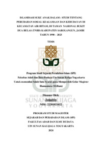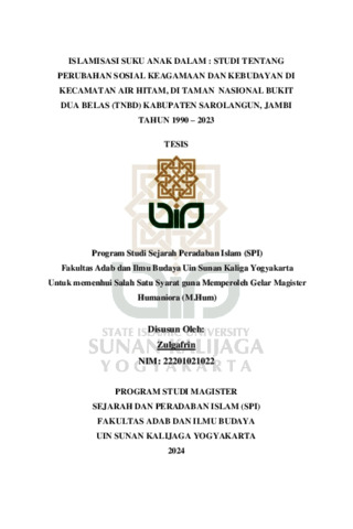 Zulgafrin, NIM.: 22201021022 (2024) ISLAMISASI SUKU ANAK DALAM : STUDI TENTANG PERUBAHAN SOSIAL KEAGAMAAN DAN KEBUDAYAN DI KECAMATAN AIR HITAM, DI TAMAN NASIONAL BUKIT DUA BELAS (TNBD) KABUPATEN SAROLANGUN, JAMBI TAHUN 1990 – 2023. Masters thesis, UIN SUNAN KALIJAGA YOGYAKARTA.