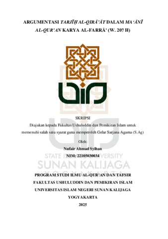 Nufair Ahmad Syihan, NIM.: 22105030034 (2025) ARGUMENTASI TARJIH AL-QIRA’AT DALAM MA‘ANI AL-QUR’AN KARYA AL-FARRA’ (W. 207 H). Skripsi thesis, UIN SUNAN KALIJAGA YOGYAKARTA.