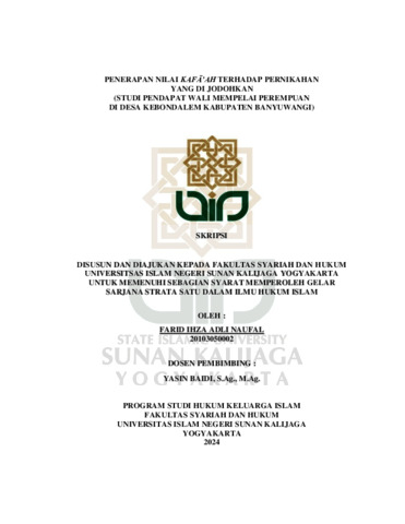 Farid Ihza Adli Naufal, NIM.: 20103050002 (2024) PENERAPAN NILAI KAFA’AH TERHADAP PERNIKAHAN YANG DI JODOHKAN (STUDI PENDAPAT WALI MEMPELAI PEREMPUAN DI DESA KEBONDALEM KABUPATEN BANYUWANGI). Skripsi thesis, UIN SUNAN KALIJAGA YOGYAKARTA.