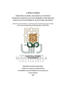 Carissa Fiza Azzahra, NIM.: 22106010034 (2026) PERBANDINGAN MODEL GEOGRAPHICALLY WEIGHTED REGRESSION (GWR) DENGAN FUNGSI PEMBOBOT FIXED BISQUARE KERNEL DAN FUNGSI PEMBOBOT ADAPTIVE BISQUARE KERNEL (STUDI KASUS: FAKTOR-FAKTOR YANG MEMENGARUHI TINGKAT PENGANGGURAN TERBUKA DI PROVINSI JAWA BARAT MENURUT KABUPATEN/KOTA TAHUN 2024). Skripsi thesis, UIN SUNAN KALIJAGA YOGYAKARTA.