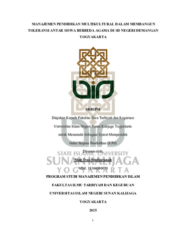 Ning Tyas Mudzayanah, NIM.: 18104090070 (2025) MANAJEMEN PENDIDIKAN MULTIKULTURAL DALAM MEMBANGUN TOLERANSI ANTAR SISWA BERBEDA AGAMA DI SD NEGERI DEMANGAN YOGYAKARTA. Skripsi thesis, UIN SUNAN KALIJAGA YOGYAKARTA.