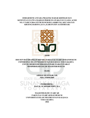 Ahmad Mustolih, NIM.: 23203012069 (2026) DISHARMONI ANTARA PRAKTIK MAHAR KHITBAH DAN KETENTUAN FATWA MAJELIS PERMUSYAWARATAN ULAMA ACEH NO. 5 TAHUN 2016 (STUDI DI MUKIM LAMREUNG, KECAMATAN KRUENG BARONA JAYA, KABUPATEN ACEH BESAR). Masters thesis, UIN SUNAN KALIJAGA YOGYAKARTA.