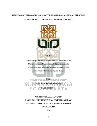 Hijri Saidatun Nisalis Tanjung, NIM.: 22105020047 (2026) KEMATANGAN BERAGAMA MAHASANTRI PENGHAFAL AL-QUR’AN DI PONDOK PESANTREN ULUL ALBAB BALIREJO YOGYAKARTA. Skripsi thesis, UIN SUNAN KALIJAGA YOGYAKARTA.