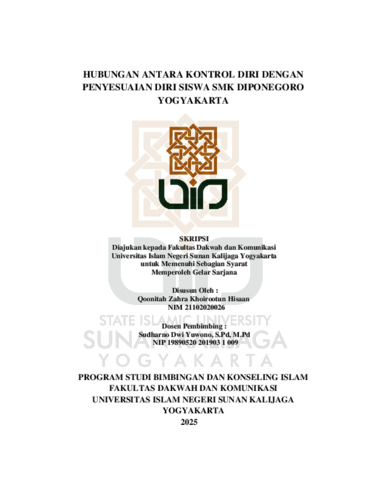 Qoonitah Zahra Khoirootun Hisaan, NIM.: 21102020026 (2025) HUBUNGAN ANTARA KONTROL DIRI DENGAN PENYESUAIAN DIRI SISWA SMK DIPONEGORO YOGYAKARTA. Skripsi thesis, UIN SUNAN KALIJAGA YOGYAKARTA.